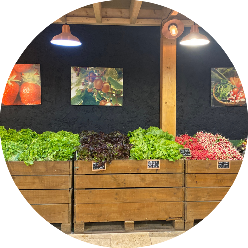 Dans ces boutiques, vous pourrez retrouver toutes les productions de la ferme en agriculture locale, de saison et raisonnée (ainsi que bio pour les pommes et kiwis). Vous pourrez également y retrouver les produits de 75 producteurs locaux ou plus lointains pour les fruits et légumes exotiques par exemple.